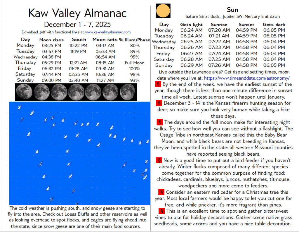 December 1 – 7, 2025 Kaw Valley Almanac Nov30 Click here to download free .pdf of December 1, 2025 Kaw Valley AlmanacDownload Share this: Click to email a link to a friend (Opens in new window) Email Click to share on Facebook (Opens in new window) Facebook Click to share on X (Opens in new window) X Click to share on Reddit (Opens in new window) Reddit Click to share on Pinterest (Opens in new window) Pinterest Click to share on Tumblr (Opens in new window) Tumblr Click to share on Pocket (Opens in new window) Pocket Click to share on LinkedIn (Opens in new window) LinkedIn Click to print (Opens in new window) Print Like Loading...