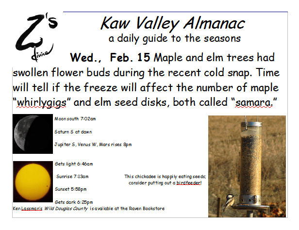 Ken Lassman has been keeping this almanac for over a decade, He invites you to share your observations and photos in the comments section. You can find his book Wild Douglas County at The Raven Bookstore in Lawrence.