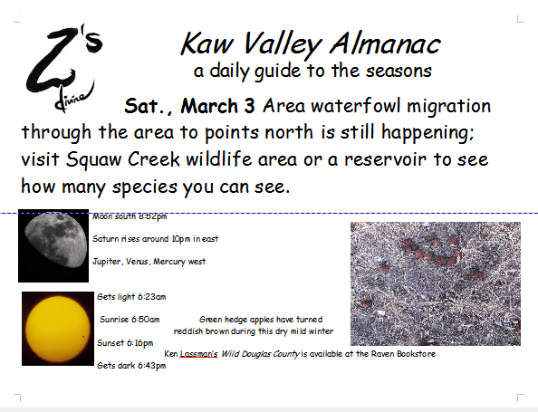 Ken Lassman has been keeping this almanac for over a decade, He invites you to share your observations and photos in the comments section. You can find his book Wild Douglas County at The Raven Bookstore in Lawrence.