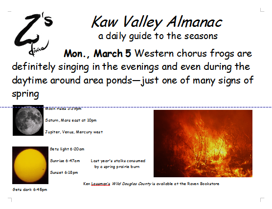 Ken Lassman has been keeping this almanac for over a decade, He invites you to share your observations and photos in the comments section. You can find his book Wild Douglas County at The Raven Bookstore in Lawrence.