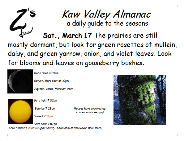 Ken Lassman has been keeping this almanac for over a decade, He invites you to share your observations and photos in the comments section. You can find his book Wild Douglas County at The Raven Bookstore in Lawrence.