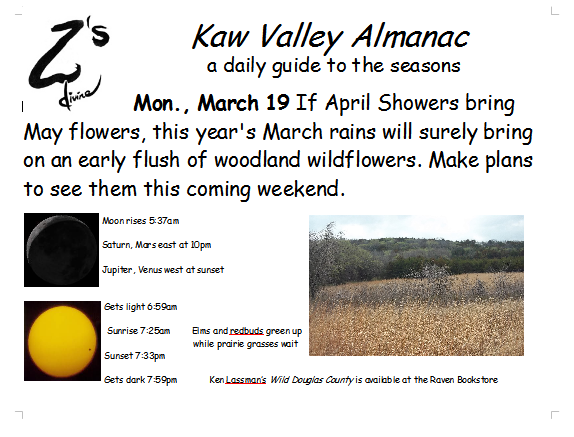 Ken Lassman has been keeping this almanac for over a decade, He invites you to share your observations and photos in the comments section. You can find his book Wild Douglas County at The Raven Bookstore in Lawrence.