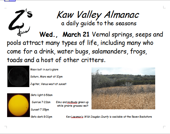 Ken Lassman has been keeping this almanac for over a decade, He invites you to share your observations and photos in the comments section. You can find his book Wild Douglas County at The Raven Bookstore in Lawrence.