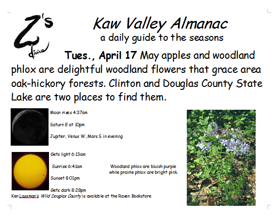 Ken Lassman has been keeping this almanac for over a decade, He invites you to share your observations and photos in the comments section. You can find his book Wild Douglas County at The Raven Bookstore in Lawrence.