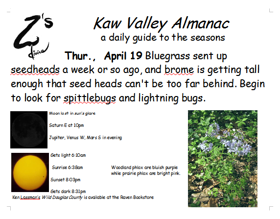 Ken Lassman has been keeping this almanac for over a decade, He invites you to share your observations and photos in the comments section. You can find his book Wild Douglas County at The Raven Bookstore in Lawrence.