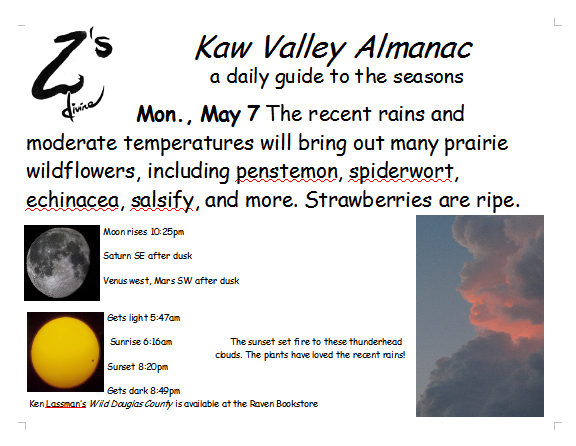 Ken Lassman has been keeping this almanac for over a decade, He invites you to share your observations and photos in the comments section. You can find his book Wild Douglas County at The Raven Bookstore in Lawrence.