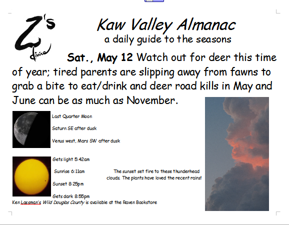 Ken Lassman has been keeping this almanac for over a decade, He invites you to share your observations and photos in the comments section. You can find his book Wild Douglas County at The Raven Bookstore in Lawrence.