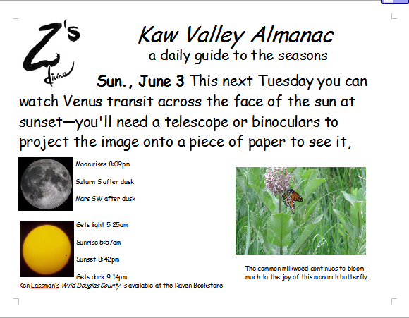 Ken Lassman has been keeping this almanac for over a decade, He invites you to share your observations and photos in the comments section. You can find his book Wild Douglas County at The Raven Bookstore in Lawrence.