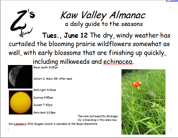 Ken Lassman has been keeping this almanac for over a decade, He invites you to share your observations and photos in the comments section. You can find his book Wild Douglas County at The Raven Bookstore in Lawrence.