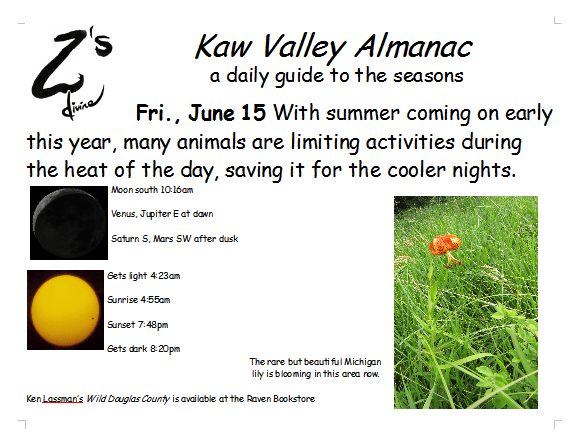 Ken Lassman has been keeping this almanac for over a decade, He invites you to share your observations and photos in the comments section. You can find his book Wild Douglas County at The Raven Bookstore in Lawrence.