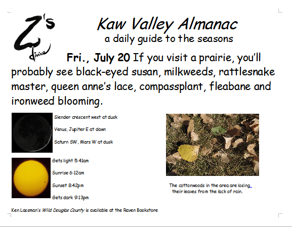 Ken Lassman has been keeping this almanac for over a decade, He invites you to share your observations and photos in the comments section. You can find his book Wild Douglas County at The Raven Bookstore in Lawrence.