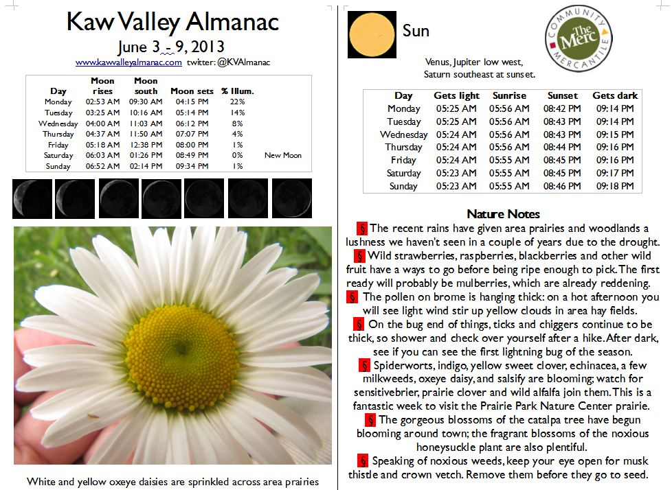 June 3 – 9, 2013 Kaw Valley Almanac Jun2 Share this: Click to email a link to a friend (Opens in new window) Email Click to share on Facebook (Opens in new window) Facebook Click to share on X (Opens in new window) X Click to share on Reddit (Opens in new window) Reddit Click to share on Pinterest (Opens in new window) Pinterest Click to share on Tumblr (Opens in new window) Tumblr Click to share on Pocket (Opens in new window) Pocket Click to share on LinkedIn (Opens in new window) LinkedIn Click to print (Opens in new window) Print Like Loading...