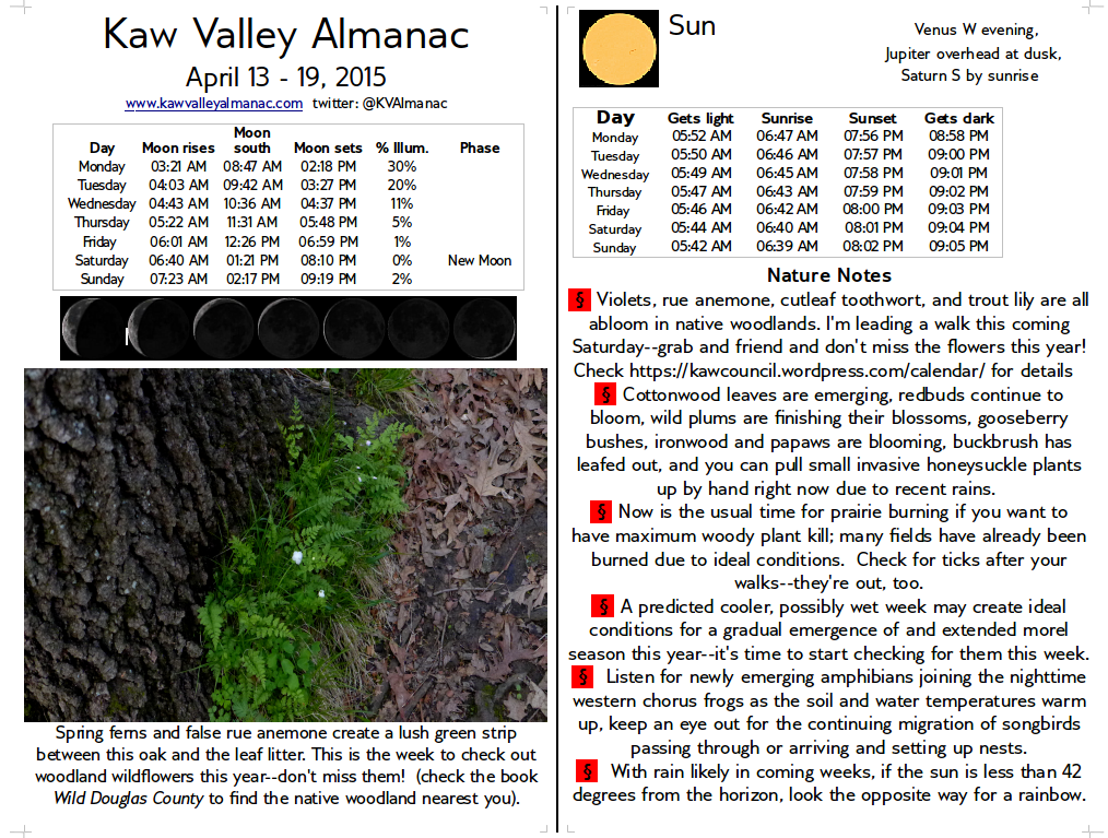 April 13 – 19, 2015 Kaw Valley Almanac Apr12 Share this: Click to email a link to a friend (Opens in new window) Email Click to share on Facebook (Opens in new window) Facebook Click to share on X (Opens in new window) X Click to share on Reddit (Opens in new window) Reddit Click to share on Pinterest (Opens in new window) Pinterest Click to share on Tumblr (Opens in new window) Tumblr Click to share on Pocket (Opens in new window) Pocket Click to share on LinkedIn (Opens in new window) LinkedIn Click to print (Opens in new window) Print Like Loading...