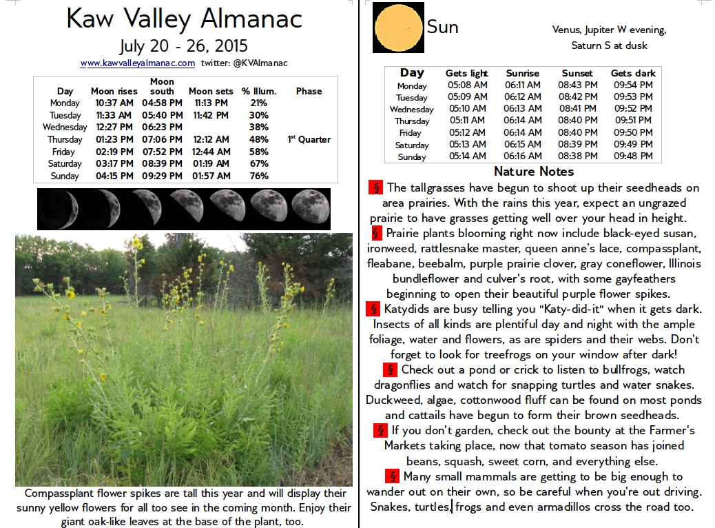 July 13 – 19, 2015 Kaw Valley Almanac Jul12 Share this: Click to email a link to a friend (Opens in new window) Email Click to share on Facebook (Opens in new window) Facebook Click to share on X (Opens in new window) X Click to share on Reddit (Opens in new window) Reddit Click to share on Pinterest (Opens in new window) Pinterest Click to share on Tumblr (Opens in new window) Tumblr Click to share on Pocket (Opens in new window) Pocket Click to share on LinkedIn (Opens in new window) LinkedIn Click to print (Opens in new window) Print Like Loading...