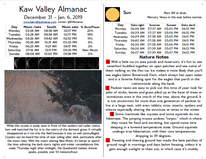 Ken, Thank you for regularly posting this almanac. I saw my first eagle of the season flying over the Kaw River Bridge yesterday. bert