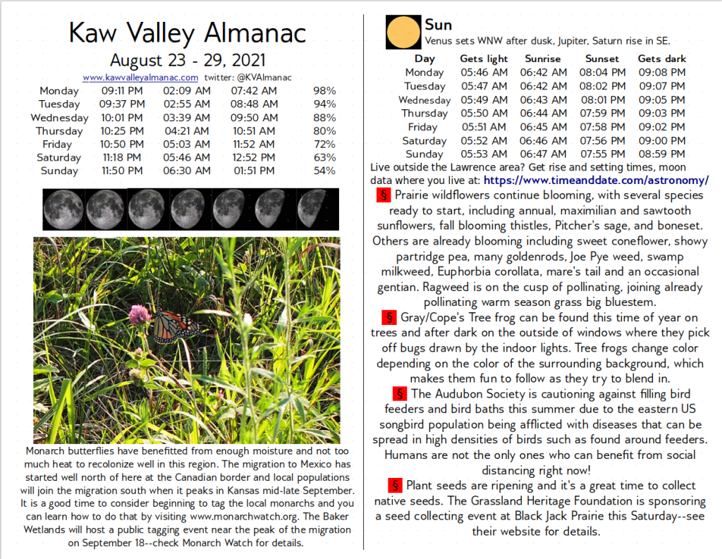 August 23 – 29, 2021 Kaw Valley Almanac Aug23 Click here to download free .pdf of August-23-2021 Kaw Valley AlmanacDownload Share this: Click to email a link to a friend (Opens in new window) Email Click to share on Facebook (Opens in new window) Facebook Click to share on X (Opens in new window) X Click to share on Reddit (Opens in new window) Reddit Click to share on Pinterest (Opens in new window) Pinterest Click to share on Tumblr (Opens in new window) Tumblr Click to share on Pocket (Opens in new window) Pocket Click to share on LinkedIn (Opens in new window) LinkedIn Click to print (Opens in new window) Print Like Loading... Related