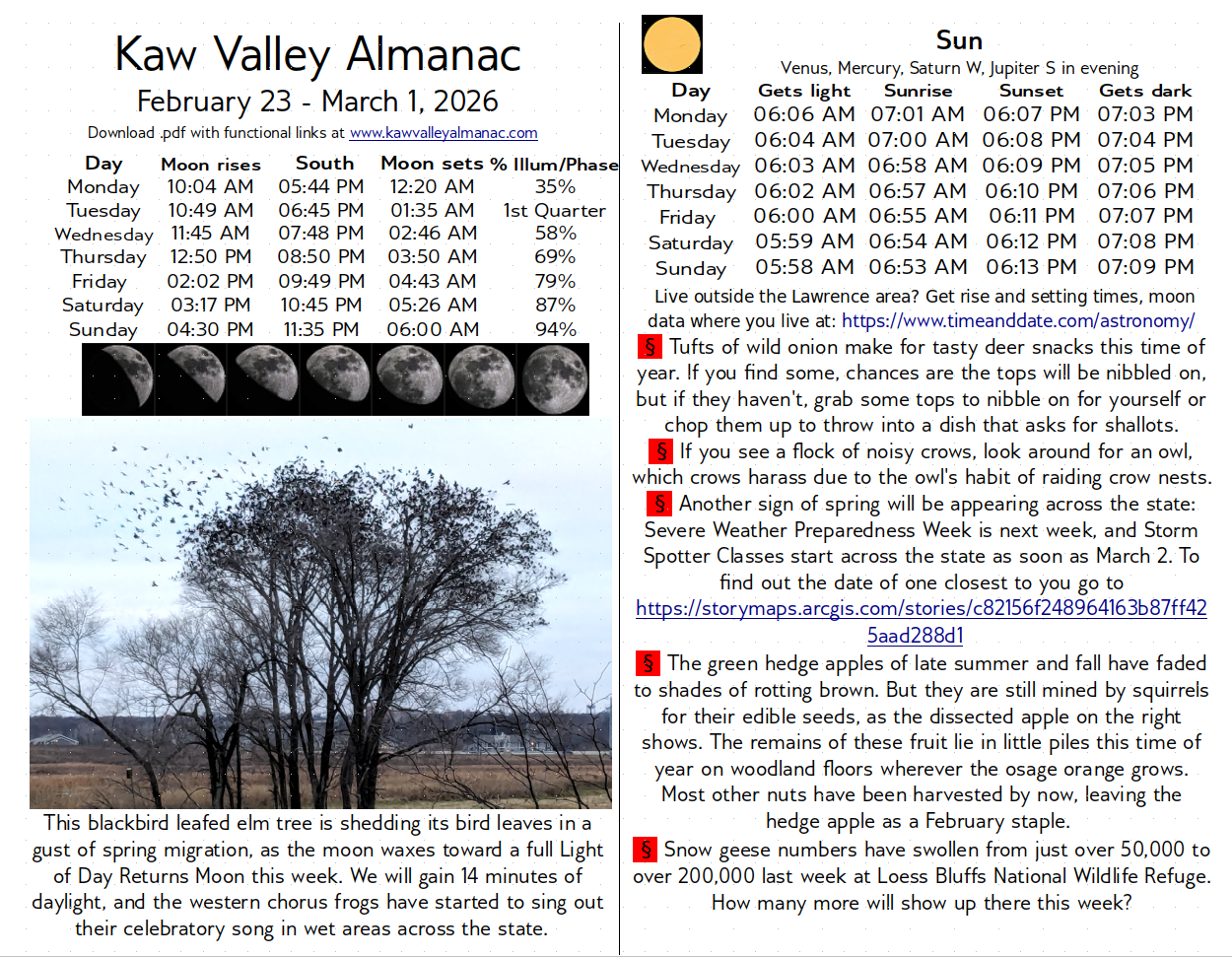 February 23 – March 1, 2026 Kaw Valley Almanac Feb22 Click here to download a free .pdf of February 23, 2026 Kaw Valley AlmanacDownload Share this: Email a link to a friend (Opens in new window) Email Share on Facebook (Opens in new window) Facebook Share on X (Opens in new window) X Share on Reddit (Opens in new window) Reddit Share on Pinterest (Opens in new window) Pinterest Share on Tumblr (Opens in new window) Tumblr Share on LinkedIn (Opens in new window) LinkedIn Print (Opens in new window) Print Like Loading... Related
