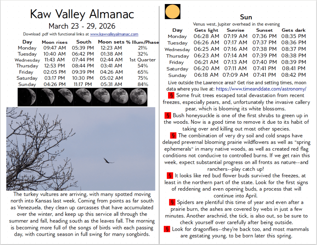 March 23 – 29, 2026 Kaw Valley Almanac Mar22 Click here to download free .pdf of March 23, 2026 Kaw Valley AlmanacDownload Share this: Email a link to a friend (Opens in new window) Email Share on Facebook (Opens in new window) Facebook Share on X (Opens in new window) X Share on Reddit (Opens in new window) Reddit Share on Pinterest (Opens in new window) Pinterest Share on Tumblr (Opens in new window) Tumblr Share on LinkedIn (Opens in new window) LinkedIn Print (Opens in new window) Print Like Loading... Related