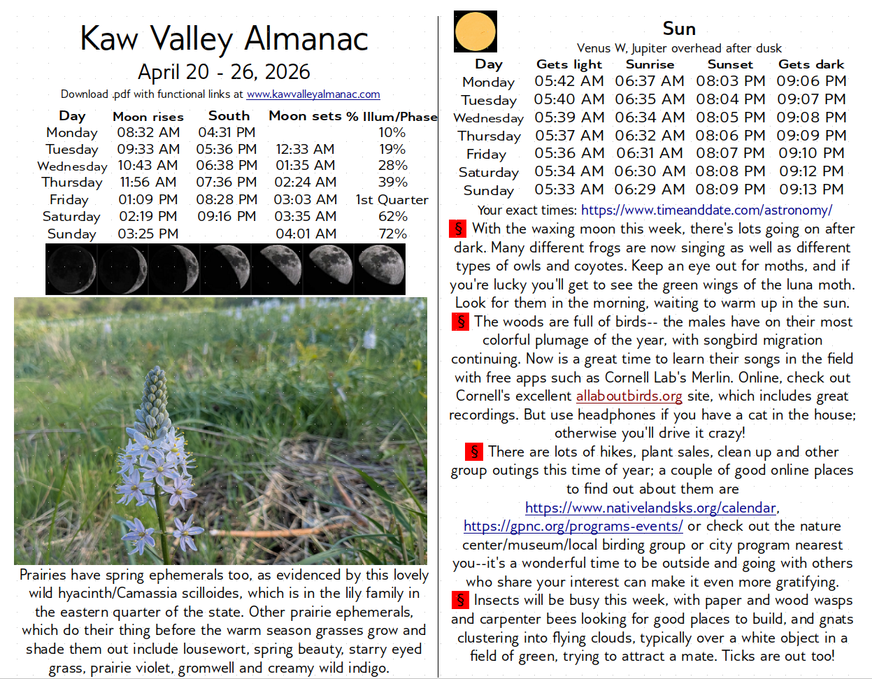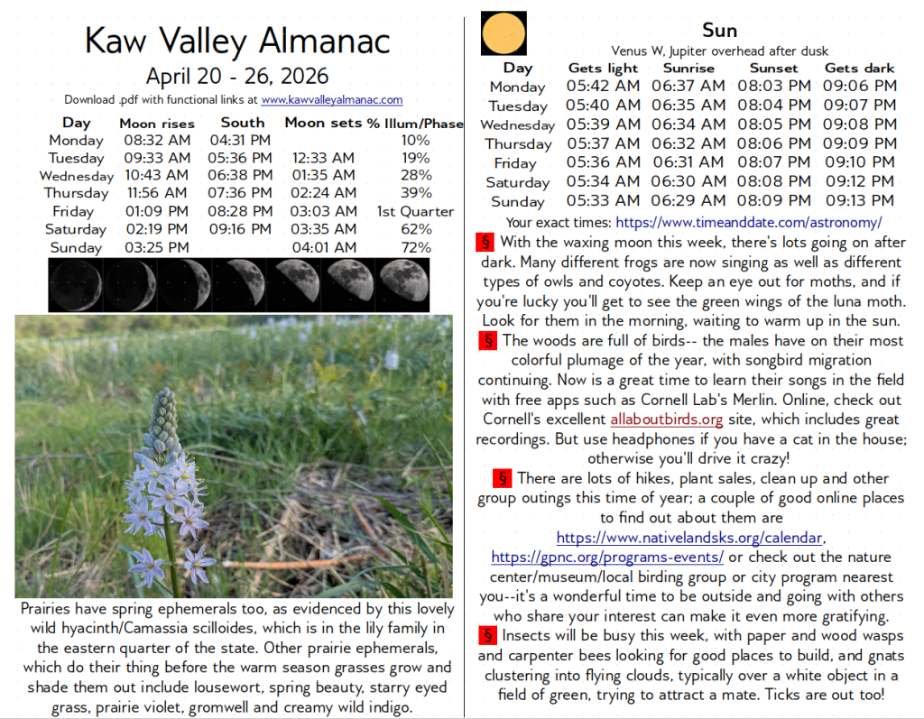 April 20 – 26, 2026 Kaw Valley Almanac Apr19 Click here to download free .pdf with functional links of the April 20, 2026 Kaw Valley AlmanacDownload Share this: Email a link to a friend (Opens in new window) Email Share on Facebook (Opens in new window) Facebook Share on X (Opens in new window) X Share on Reddit (Opens in new window) Reddit Share on Pinterest (Opens in new window) Pinterest Share on Tumblr (Opens in new window) Tumblr Share on LinkedIn (Opens in new window) LinkedIn Print (Opens in new window) Print Like Loading... Related