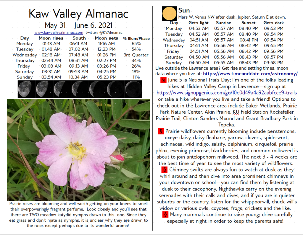 May 31 – June 6, 2021 Kaw Valley Almanac May30 Click here to download free .pdf of May-31-2021 Kaw Valley AlmanacDownload Share this: Click to email a link to a friend (Opens in new window) Email Click to share on Facebook (Opens in new window) Facebook Click to share on X (Opens in new window) X Click to share on Reddit (Opens in new window) Reddit Click to share on Pinterest (Opens in new window) Pinterest Click to share on Tumblr (Opens in new window) Tumblr Click to share on Pocket (Opens in new window) Pocket Click to share on LinkedIn (Opens in new window) LinkedIn Click to print (Opens in new window) Print Like Loading...